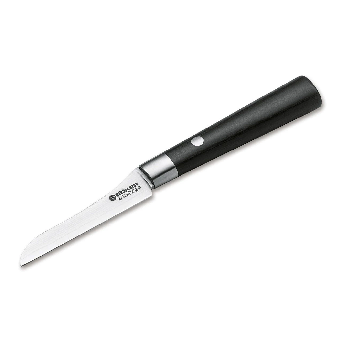 The Boker Damascus Black Kitchen Knife line combines traditionally Japanese handles made of black Plywood with razor-sharp blades made of stainless Damascus with 37 layers of steel, characterized by a beautiful grain. The extremely high-impact core of the Damascus blade consists of the high-performance VG-10 steel. The noticeable sharpness when cutting is breathtaking and makes cooking an experience. The Japanese design of the knife handle with the matted stainless steel clamps gives the line its special character.