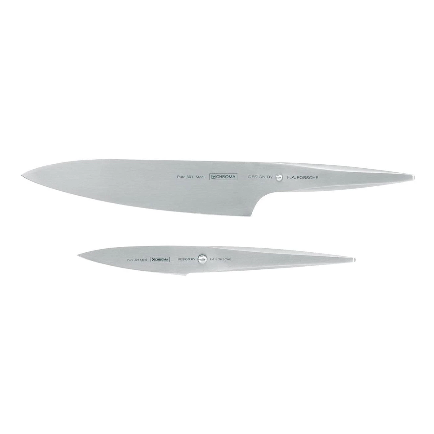 The handle of the CHROMA type 301 – Design by F.A. Porsche is constructed of stainless steel, and the blade is made of high-quality Japanese 301 steel. The blade of each knife is carefully razorsharp sharpened by the hand of a master.