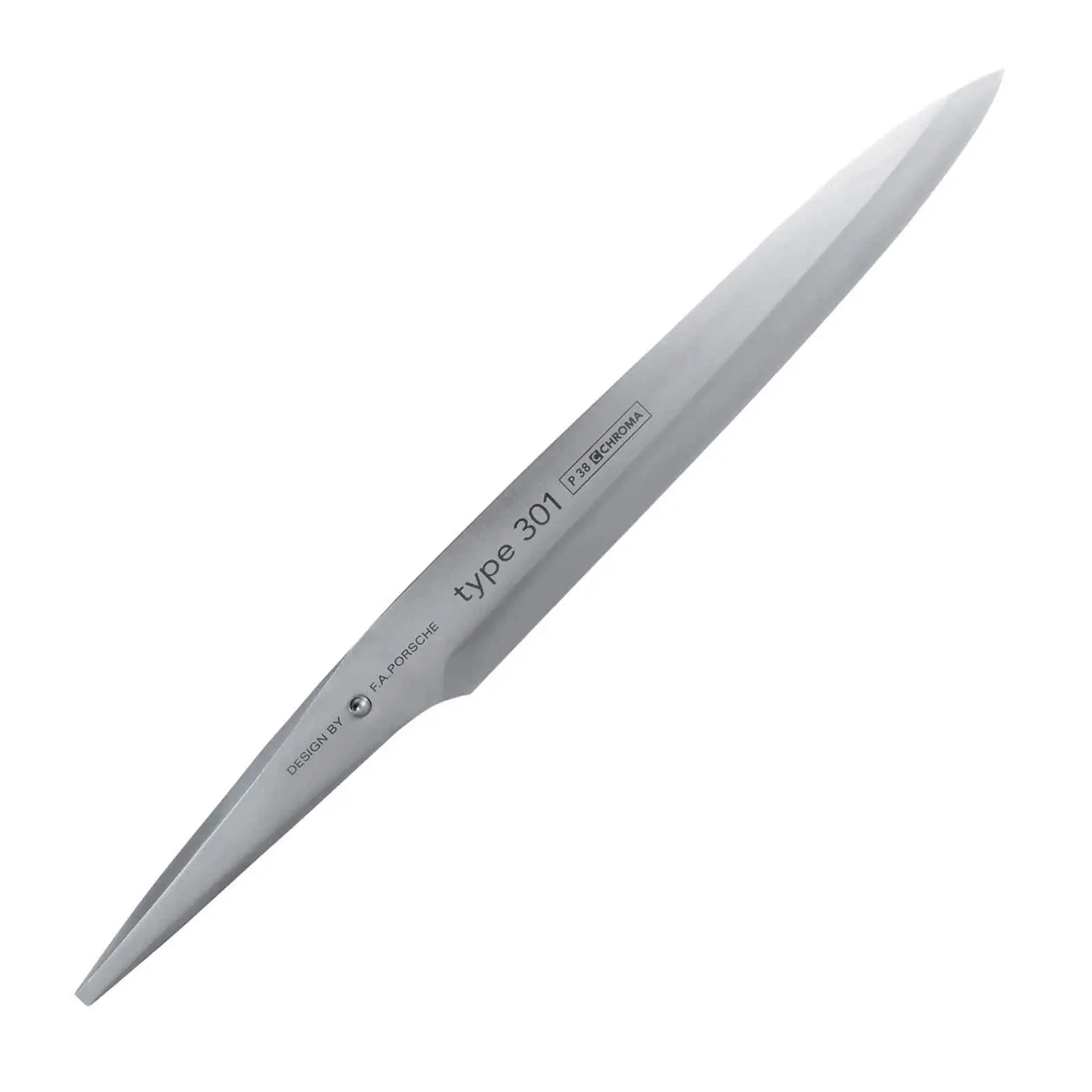 P38- 9 3/4″ Sashimi Knife designed by F.A. Porsche. The handle of the CHROMA type 301 – Design by F.A. Porsche is constructed of stainless steel, and the blade is made of high-quality Japanese 301 steel. The blade of each knife is carefully razorsharp sharpened by the hand of a master.