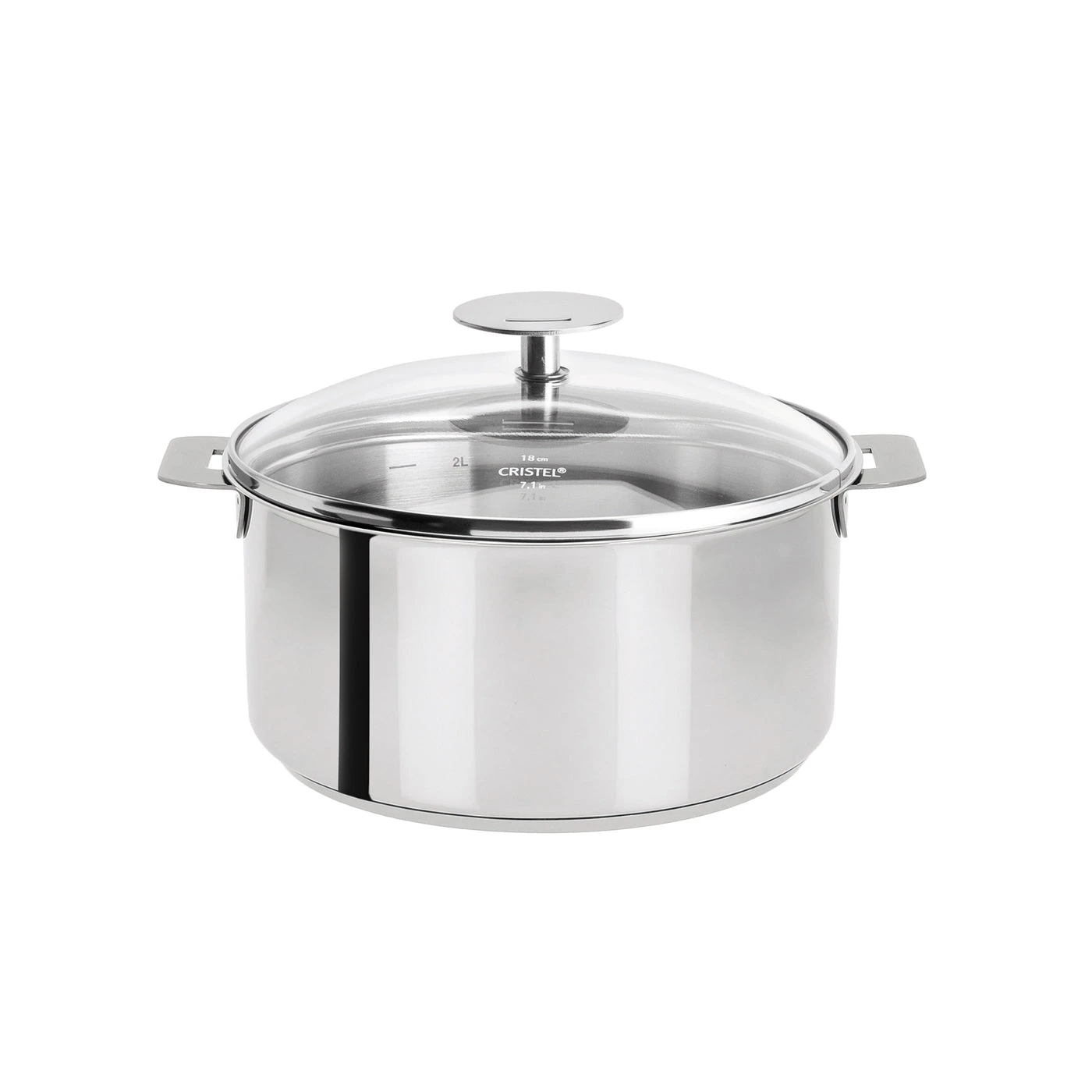 18/10 stainless saucepan, mirror finish, removable handle, from the Removable Mutine collection. Mutine 2 Qt Saucepan w/Lid is a must for your kitchen. The removable-handle concept enables perfect stacking of Cristel stock pots and saucepans, for significant space savings in your cupboards and dishwasher. Thanks to the efficiency of Cristel induction-compatible heat-diffusing base, Removable Mutine saucepans can be used in any kitchen and will be of valuable help for the preparation of your dishes. The practical removable-handle system lets you turn your stainless saucepan into a stock pot by replacing the handle with the grips. Mutine saucepans are made of 18/10 stainless steel. They preserve the taste of food and are easy to clean after use. Requires removable handles or grips – Sold Separately. – C18PK – 2 – W10