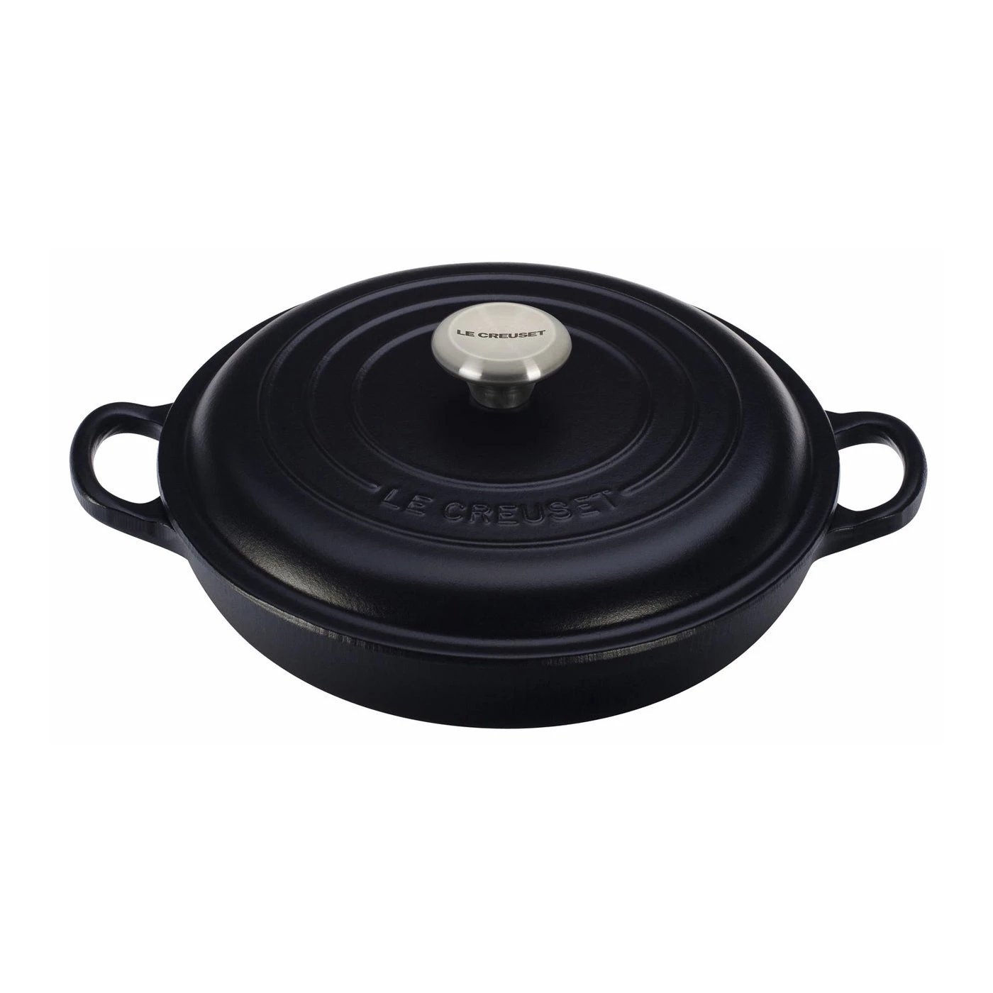 The Le Creuset enameled cast iron Braiser is uniquely designed to provide steady, even heat to transform tough cuts of meat and hearty vegetables into tender, flavorful dishes. The wide base allows ingredients to be placed in a single layer for searing without crowding; once liquid is added, the domed lid circulates steam to lock in moisture and flavor. The versatile shape of the braiser also makes it perfect for shallow frying, steaming, stews, casseroles and serving at the table.