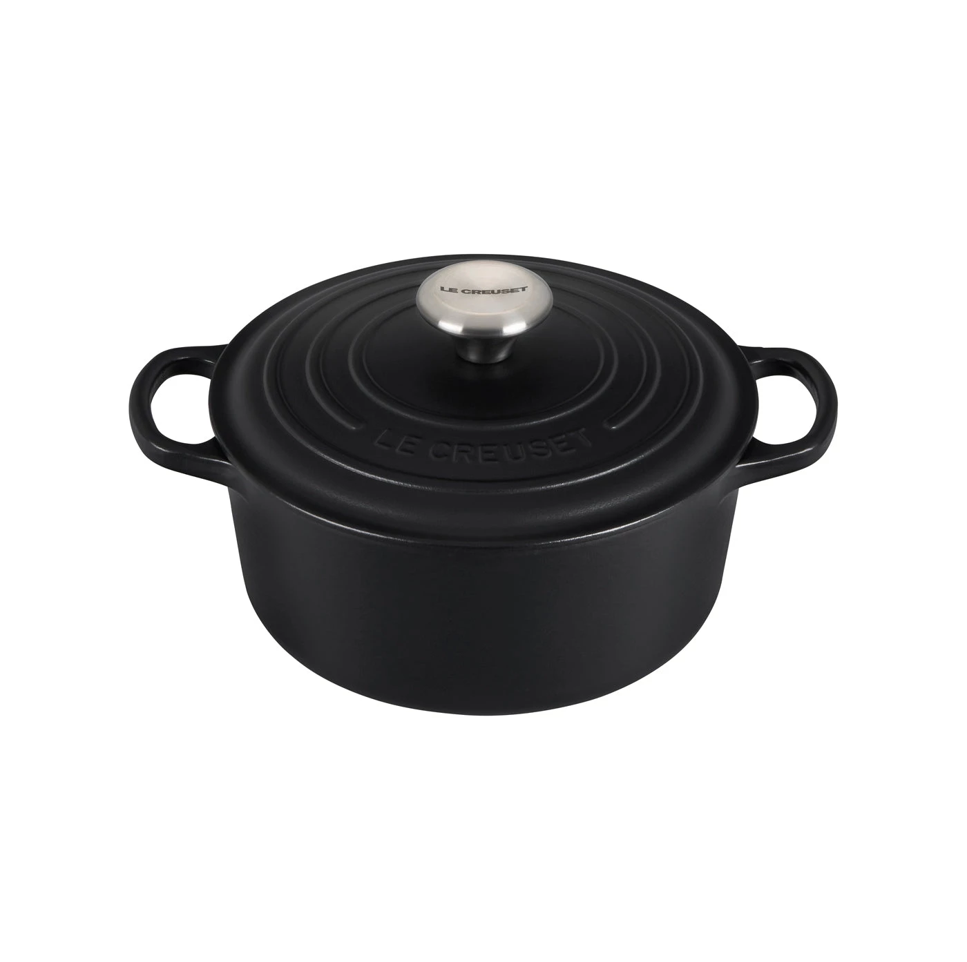 Signature black phenolic knob is oven-safe up to 500°F