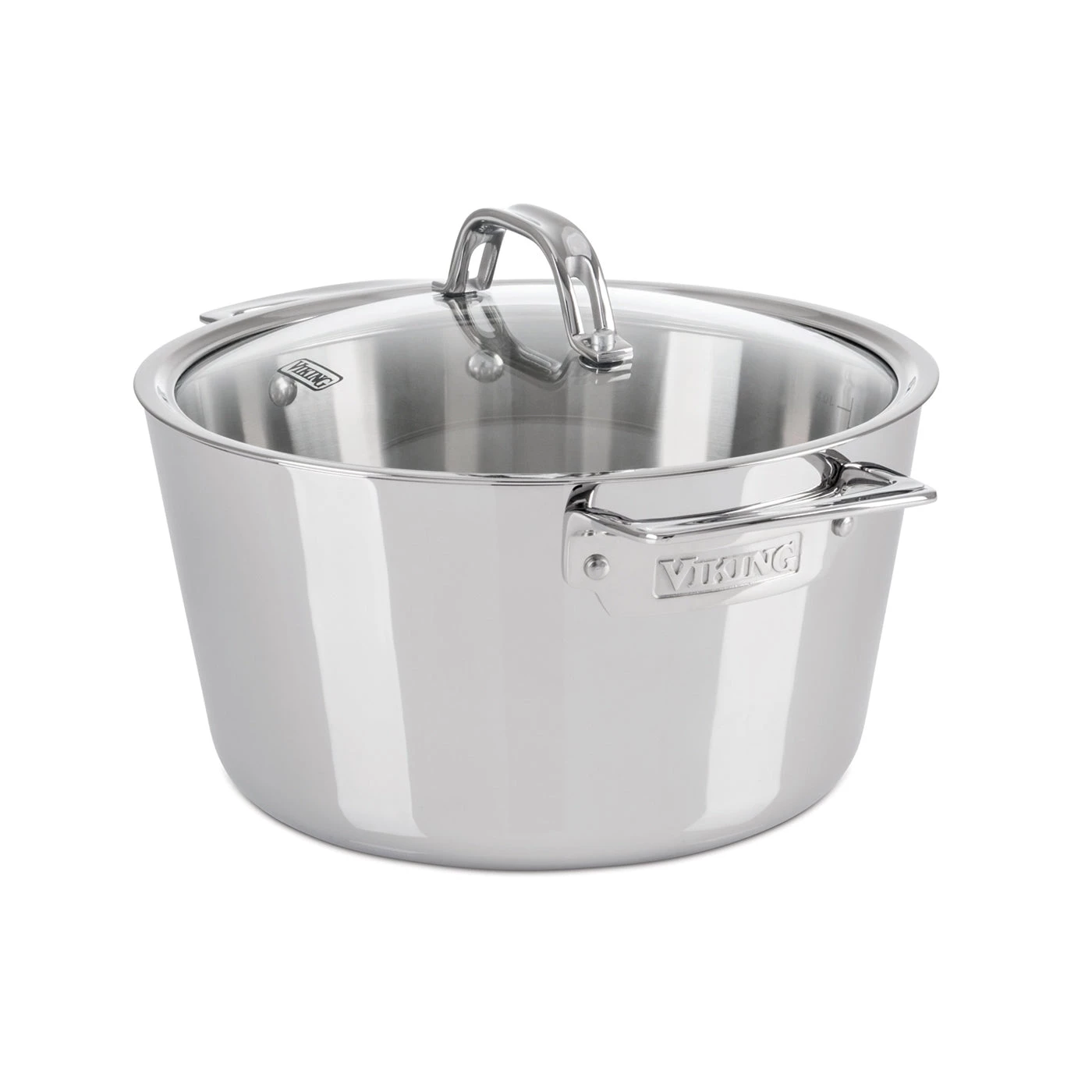 Viking Contemporary 3-Ply Cookware combines a layer of aluminum sandwiched between heavy-gauge stainless steel for superior performance. The aluminum core provides exceptional heat transfer throughout the pans, while the magnetic stainless steel exterior gives the pans durability and makes them induction capable. Featuring a seamless rim, the vented glass lids allow you to easily see the progress of your meal while reducing the chance of boil-overs. Viking Contemporary cookware combines a fashionable conic shape with signature stay-cool handles and easy to read internal volume measurements.