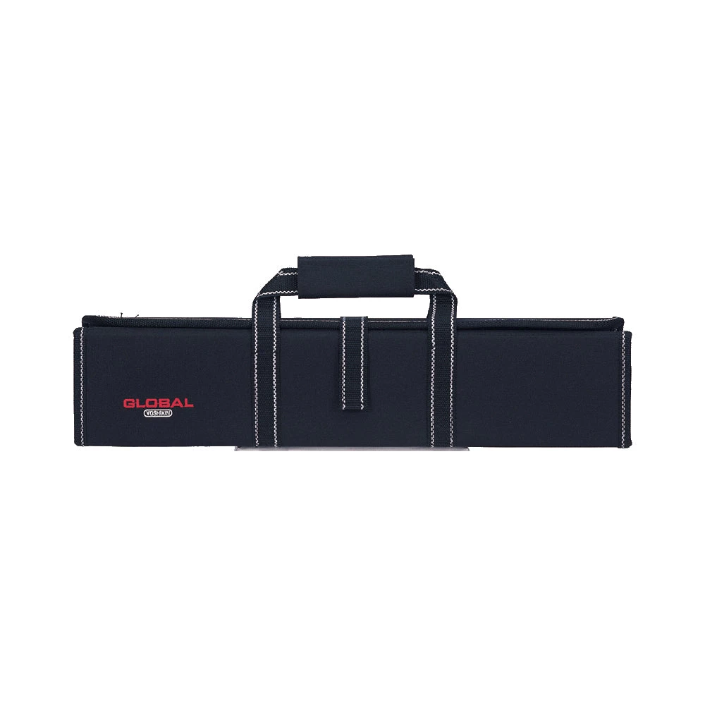 Hard knife case with a carrying handle and velcro straps to keep the case folded. It holds eleven knives. The knives are secured inside the case with a zipper enclosure. It is made of black, heavy-duty Denier nylon which is durable and easily cleaned with mild soap and water. The case features the Global logo and white stitching as an attractive contrast. – G-667/11 – 0 – A119