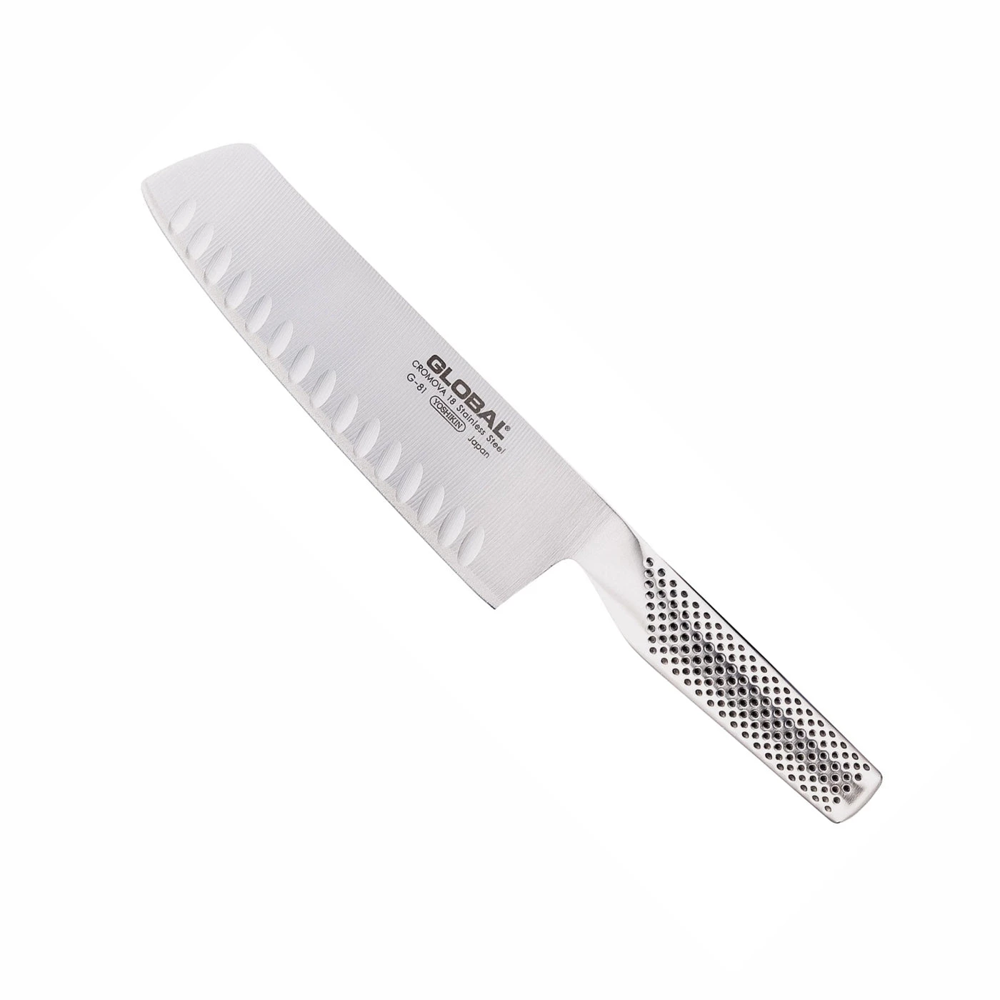 Also known as a Nakiri knife with hollow ground/granton edge. A Japanese-style square-tip knife that is great for chopping meat, root vegetables and big prep jobs. Popular alternative to the Santoku. The scalloped grooves on the sides of the blade edge helps with reducing friction and sticking of foods.