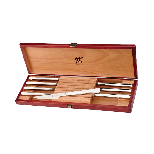 Henckels 8Pc Steak Set. This 8 Piece Steak Knife set comes beautifully boxed in an heirloom quality presentation box with a deep mahogany finish. The stainless steel knives feature a 4 inch serrated blade, angled to minimize wrist strain while slicing. The full stainless design matches stainless steel flatware patterns for an elegant table setting. Knives rest at an angle in wood slots making them easy to retrieve. The box measures 15 inches long, 5 inches wide, and 1-3/4 inches deep and has brass clasps.