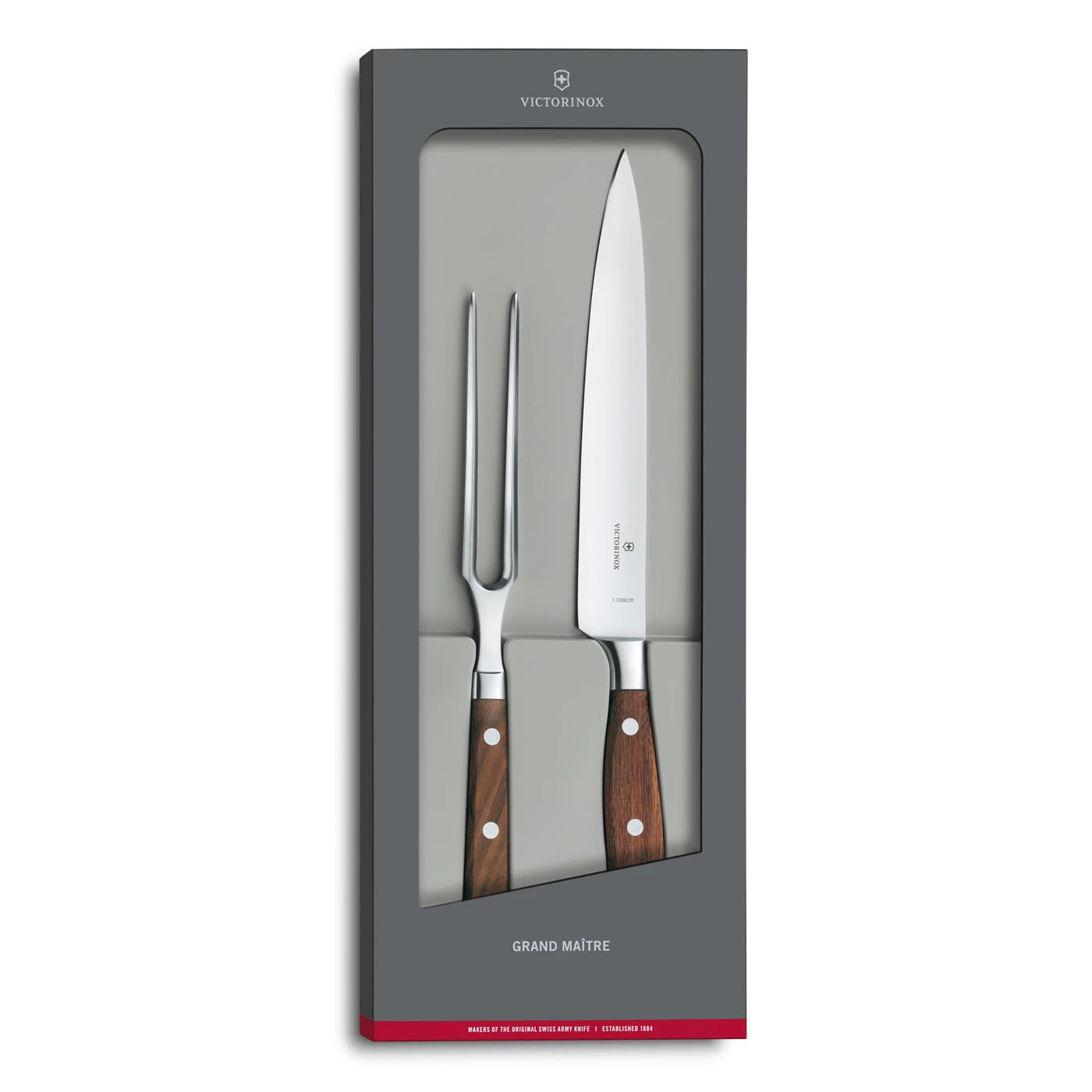 This beautiful and perfectly matched pair is all that’s required by home cooks and professional chefs alike for the neat and efficient carving of joints of meat or fowl. The two pieces of the Grand Maitre Carving Set are the Carving Knife and Carving Fork from the Victorinox professional range of full tang forged knives. Both pieces feature an elegant rosewood handle that is hand-polished and ergonomically designed so that no matter the number of strokes required to serve roasted food, neither will rub nor cause any discomfort. Like all the knives in this range, this Carving Knife and Fork are uniformly hardened and are perfectly balanced.