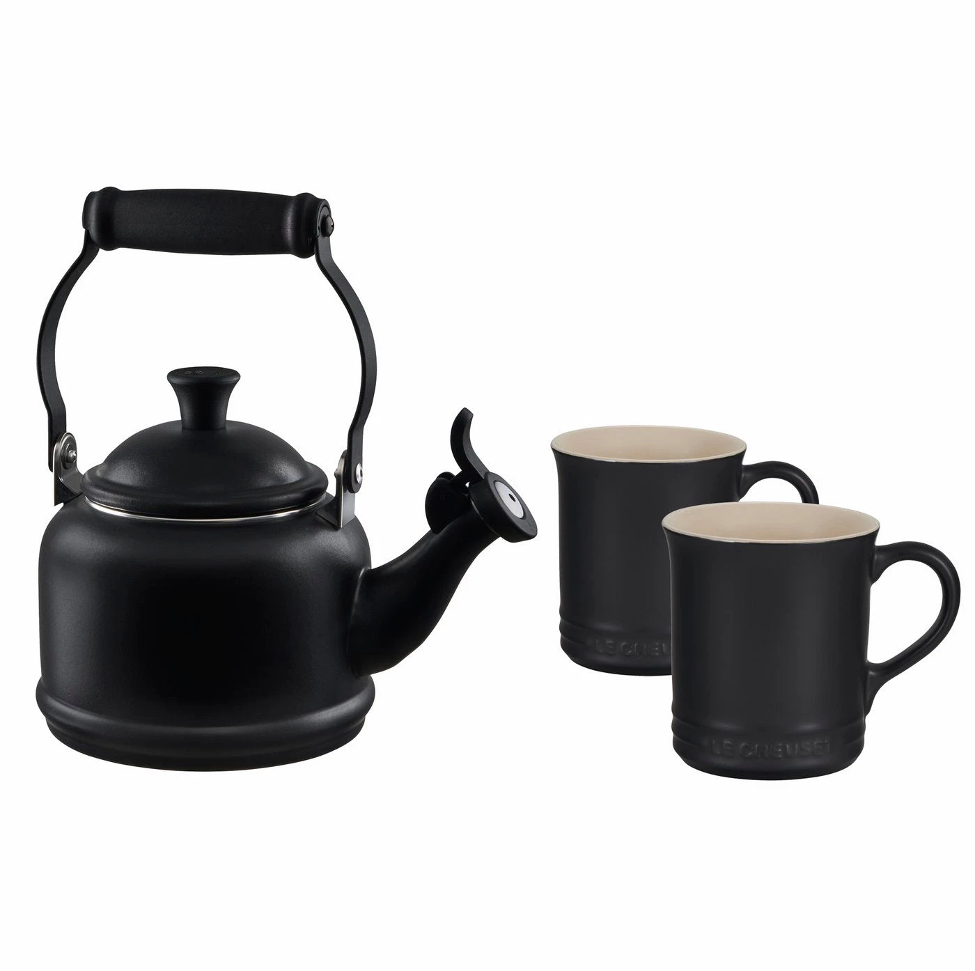 Le Creuset enamel on steel kettles are crafted of sturdy carbon steel and finished with a vibrant porcelain enamel finish. Mugs are made of durable stoneware and generously sized for enjoying coffee, tea, soup or ice cream.