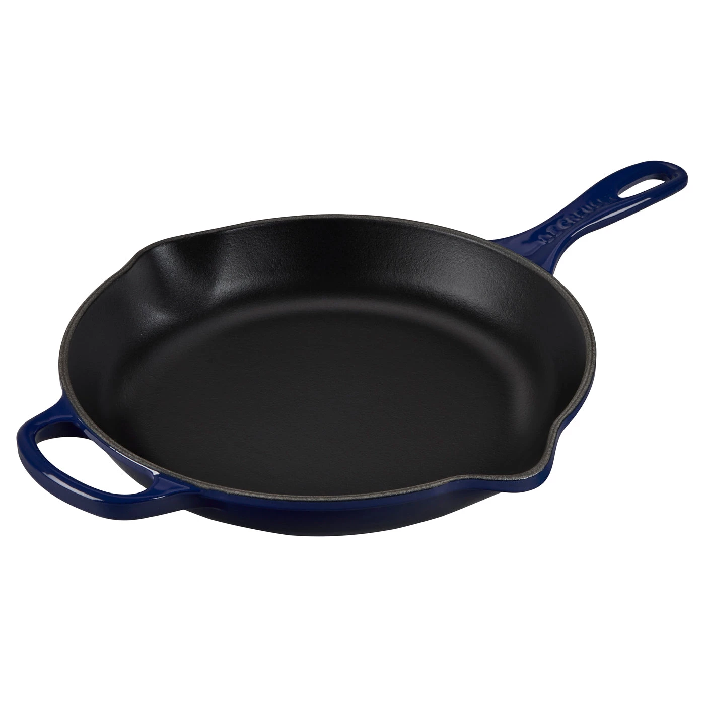 Cast iron skillets are indispensable in the kitchens of home cooks and professional chefs alike. The interior surface of a Le Creuset skillet is finished with a matte black enamel that eliminates the need for the traditional seasoning and maintenance of raw cast iron. Specially formulated for high-surface temperature cooking, the enamel develops a natural patina over time that is ideal for searing, sauteing and frying.