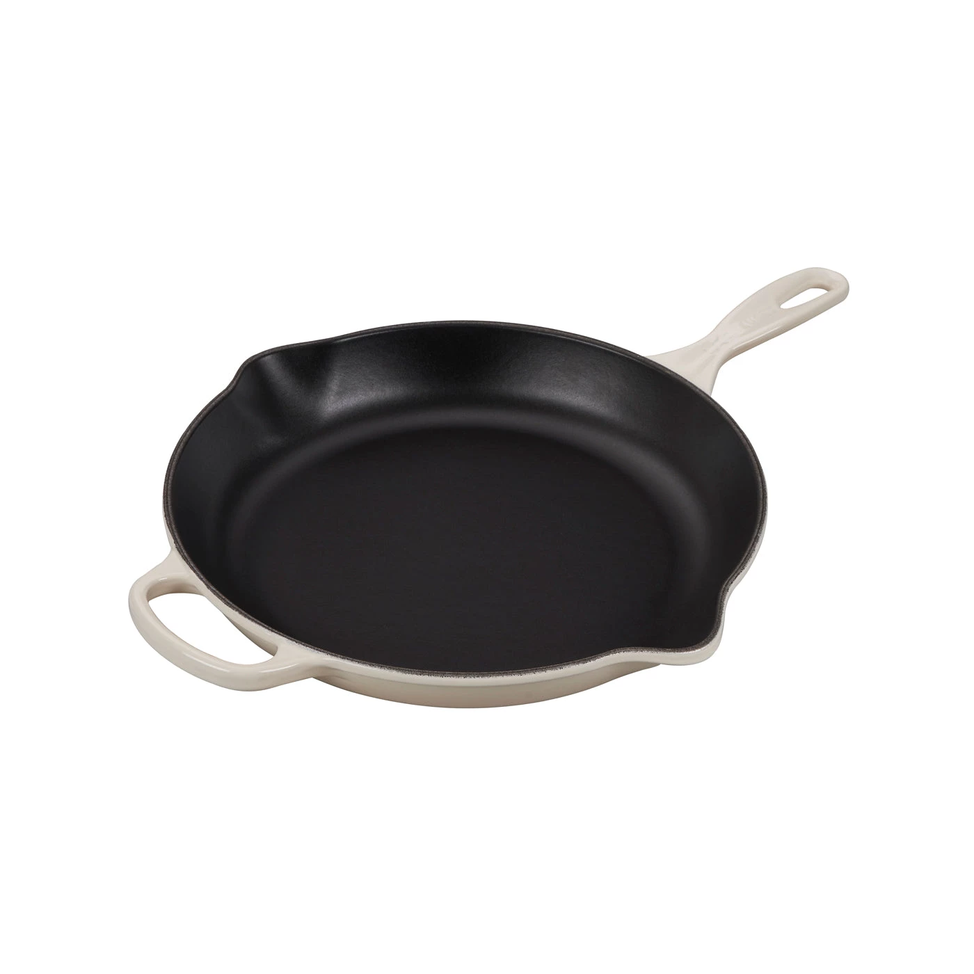 Cast iron skillets are indispensable in the kitchens of home cooks and professional chefs alike. The interior surface of a Le Creuset skillet is finished with a matte black enamel that eliminates the need for the traditional seasoning and maintenance of raw cast iron. Specially formulated for high-surface temperature cooking, the enamel develops a natural patina over time that is ideal for searing, sauteing and frying.