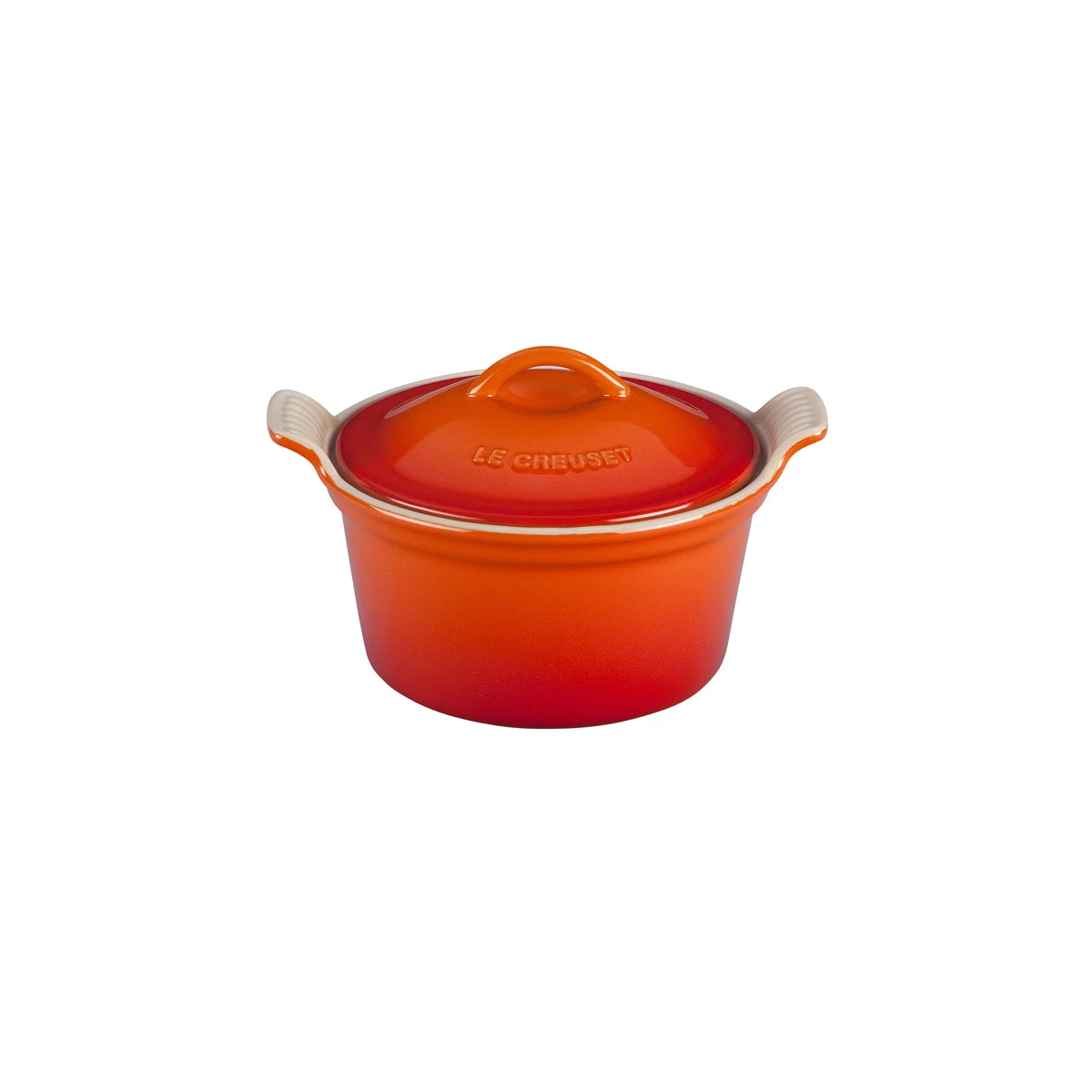 The Heritage Collection stoneware cocotte is a distinctive serving piece for classic French recipes and family favorites. The traditional loop handle and scalloped side handles recall designs of the 1930s and 1940s. This cocotte is great for baking hot dips, and its 18 oz. capacity makes it a unique dish for serving souffles or baked pastas.