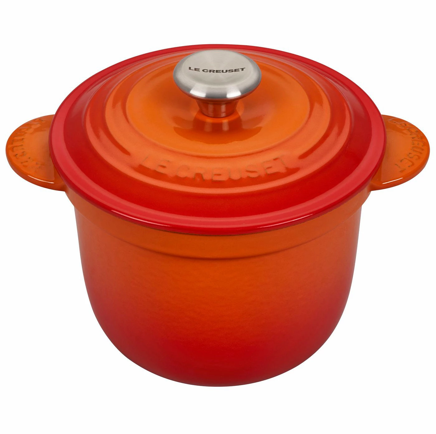 Make the perfect batch of rice and grains every time with the Le Creuset Cast Iron Rice Pot. Tall curved sides and a precision lid promote convection and moisture circulation for evenly cooked grains, and the stoneware inner lid is formulated with steam vents to prevent boil over. Crafted from our legendary cast iron, the Rice Pot has exceptional heat distribution and retention qualities for precise temperature control. The colorful enameled surface minimizes sticking and staining, requires no pre-seasoning, and is easy-to-clean.