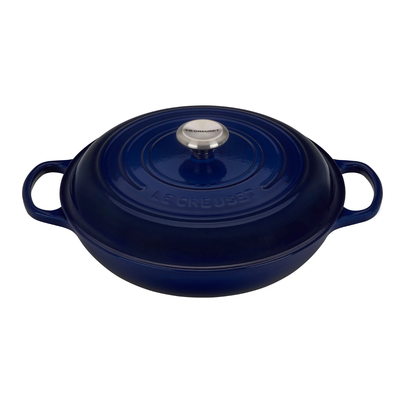 The enameled cast iron braiser is uniquely designed for maximum performance, transforming tough cuts of meat and hearty vegetables into tender, flavorful dishes. Food is first seared over high heat, then finished slowly in a flavorful liquid. The wide base of the braiser allows ingredients to be placed in a single layer for proper searing; once liquid is added, the domed lid continuously circulates steam to lock in moisture and flavor.