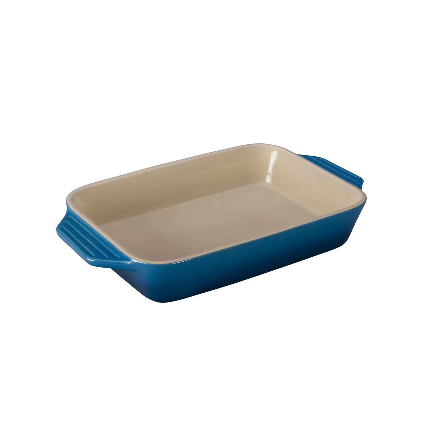 The 3 3/20 qt. rectangular dish is deep enough for lasagnas and roasts – even with a layer of vegetables underneath to create an organic roasting rack for meats.