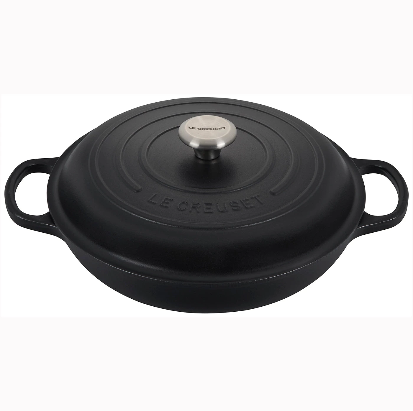 Signature black phenolic knob is oven-safe up to 500°F