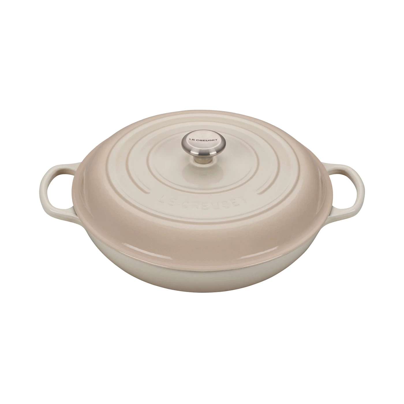 The enameled cast iron braiser is uniquely designed for maximum performance, transforming tough cuts of meat and hearty vegetables into tender, flavorful dishes. Food is first seared over high heat, then finished slowly in a flavorful liquid. The wide base of the braiser allows ingredients to be placed in a single layer for proper searing; once liquid is added, the domed lid continuously circulates steam to lock in moisture and flavor.