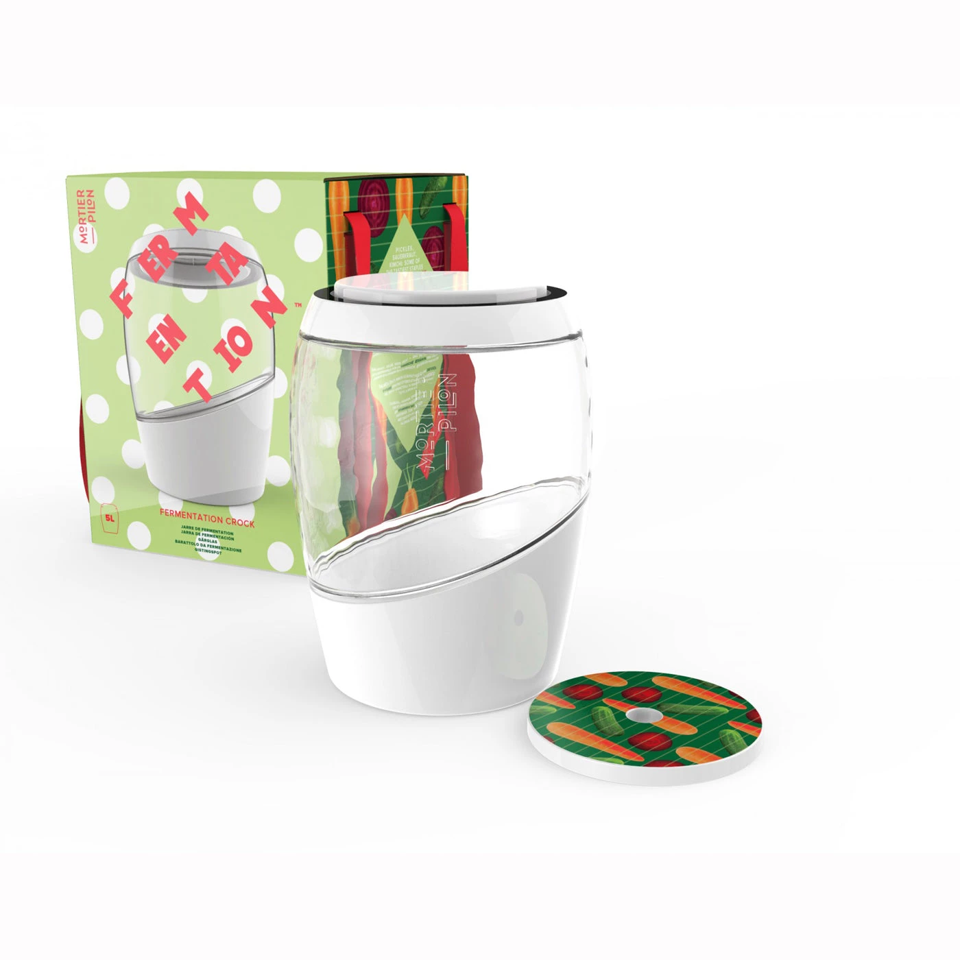 Sauerkraut, pickles, kimchi—some of the tastiest staples of a vitamin-rich diet are obtained through fermentation. This versatile, durable glass crock lets you make of all those, and then some—all for a third of the cost of most crocks on the market. Co2 escapes the jar through a water seal. This crock has a capacity of up to 5 litres (176 oz.) of vegetables, brine and seasonings, allowing you to ferment larger amounts of your favorite nutrient-packed produce. The rewritable label makes it easy to identify each batch, and the included recipe booklet provides directions for first-timers and inspiration for veterans. The interior of all Mortier Pilon crocks and jars is 100% glass. The white parts on the outside of the crocks and jars are made of non-reactive, BPA-free plastic, and do not come into contact with the food. – 100678-MOR – 25 – W99