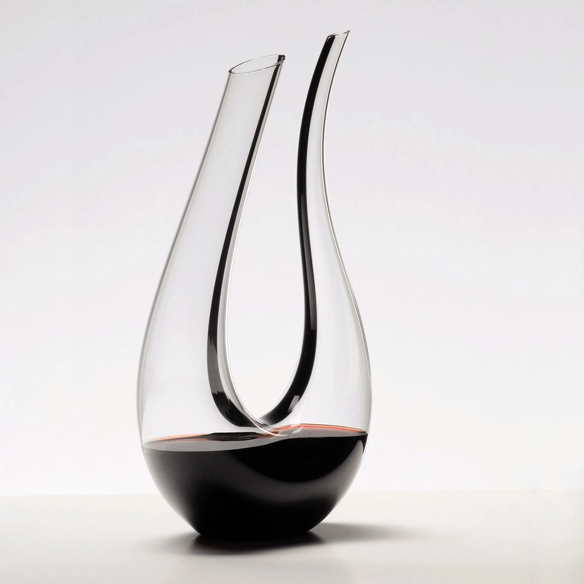 The Amadeo Black Tie Decanter shares the same graceful lyre form as the other decanters in the line, but adds a distinctive difference. Its flawless clear crystal body is articulated with a single slender black tuxedo stripe that lovingly follows the contours of its stylized U-shaped silhouette. A prime example of streamlined chic, this new decanter is a marvelous companion to Riedel’s Sommeliers Black Tie glasses, with their black stems and clear bases for red wine and clear stems and black bases for white. – 4100/83 – 0 – C44