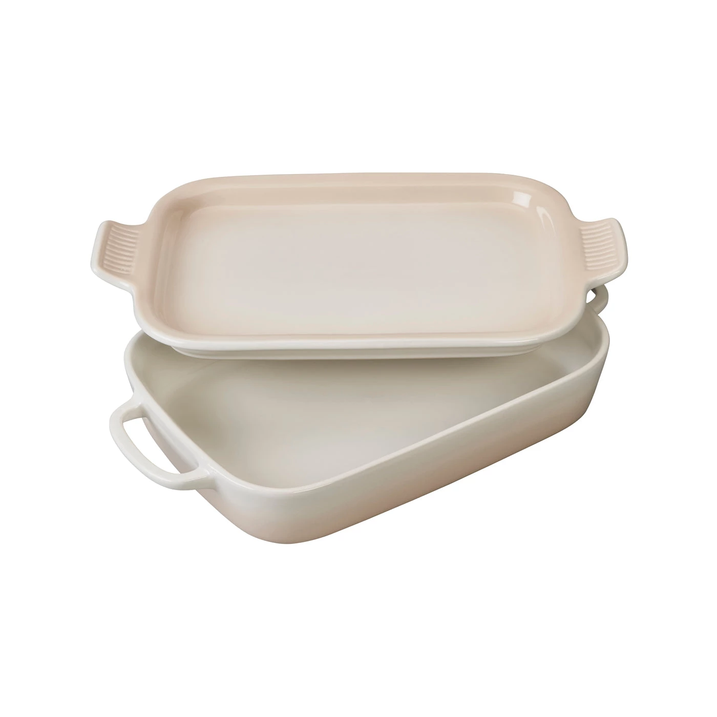 Le Creuset stoneware casseroles offer superior, highly functional performance in the oven and at the table. These durable stoneware dishes include tight-fitting lids and easy-to-grip grooved side handles, and are designed for a multitude of kitchen tasks, whether baking desserts, oven-roasting meats, broiling fish or simply marinating before cooking.