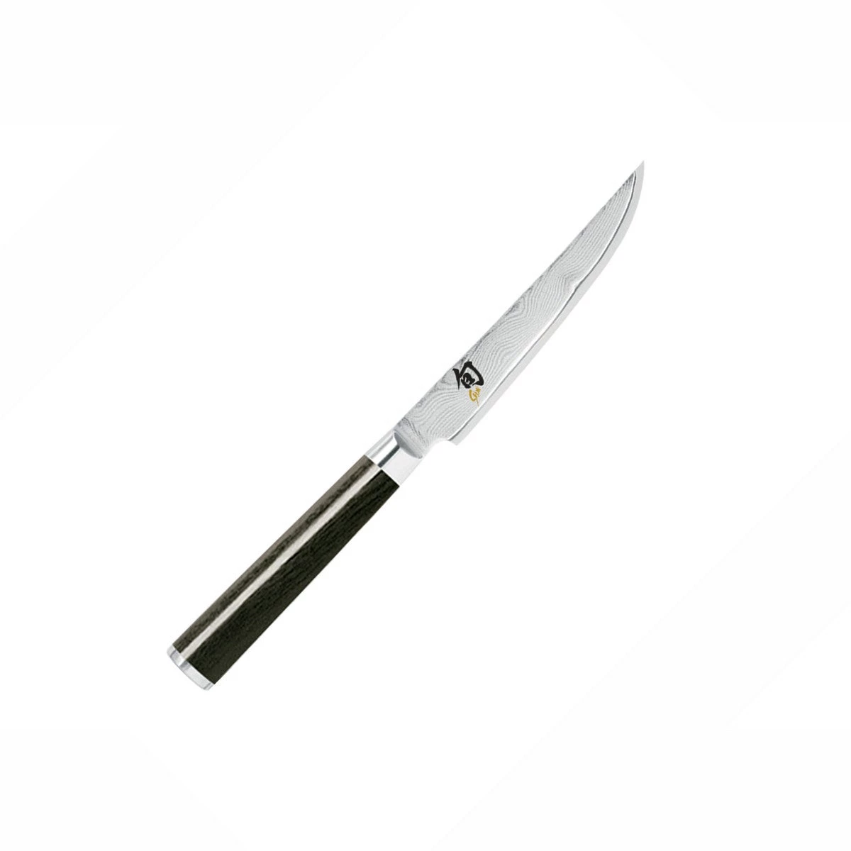You’ve grilled the perfect steaks, but how best to cut up your masterpiece once it’s on the plate? The answer is the Shun Classic Steak Knife. With Shun’s incredibly sharp, clean edge, there is no need for serrations. The knife simply glides through your steak, keeping flavor where it belongs, and enhancing your dining experience. While you won’t eat steak every day, owning a special knife that will cut through your delicious steaks is one of the great pleasures of life. Remember that cutting against the hard surface of ceramic or glass dinner plates is tough on your edge so these knives will require a little extra care. The Shun Classic Steak Knife is part of the Shun Classic line of tasteful and contemporary cutlery. The Shun Classic line features beautiful Damascus-clad blades and D-shaped ebony PakkaWood® handles. Yet behind these handcrafted knives’ beauty is function: razor-sharp blades offering top performance. Shun’s proprietary high-performance VG-MAX steel, which provides incredible edge retention, is clad with Damascus stainless steel, then ground and bead-blasted, revealing the flowing pattern of the layered steel. The result is a line of knives that are sharp, durable, and corrosion resistant, as well as beautiful to behold. The Shun Classic line also offers you the widest assortment of both traditional culinary blade shapes and cutting-edge designs, so you can always find the right knife for the task.