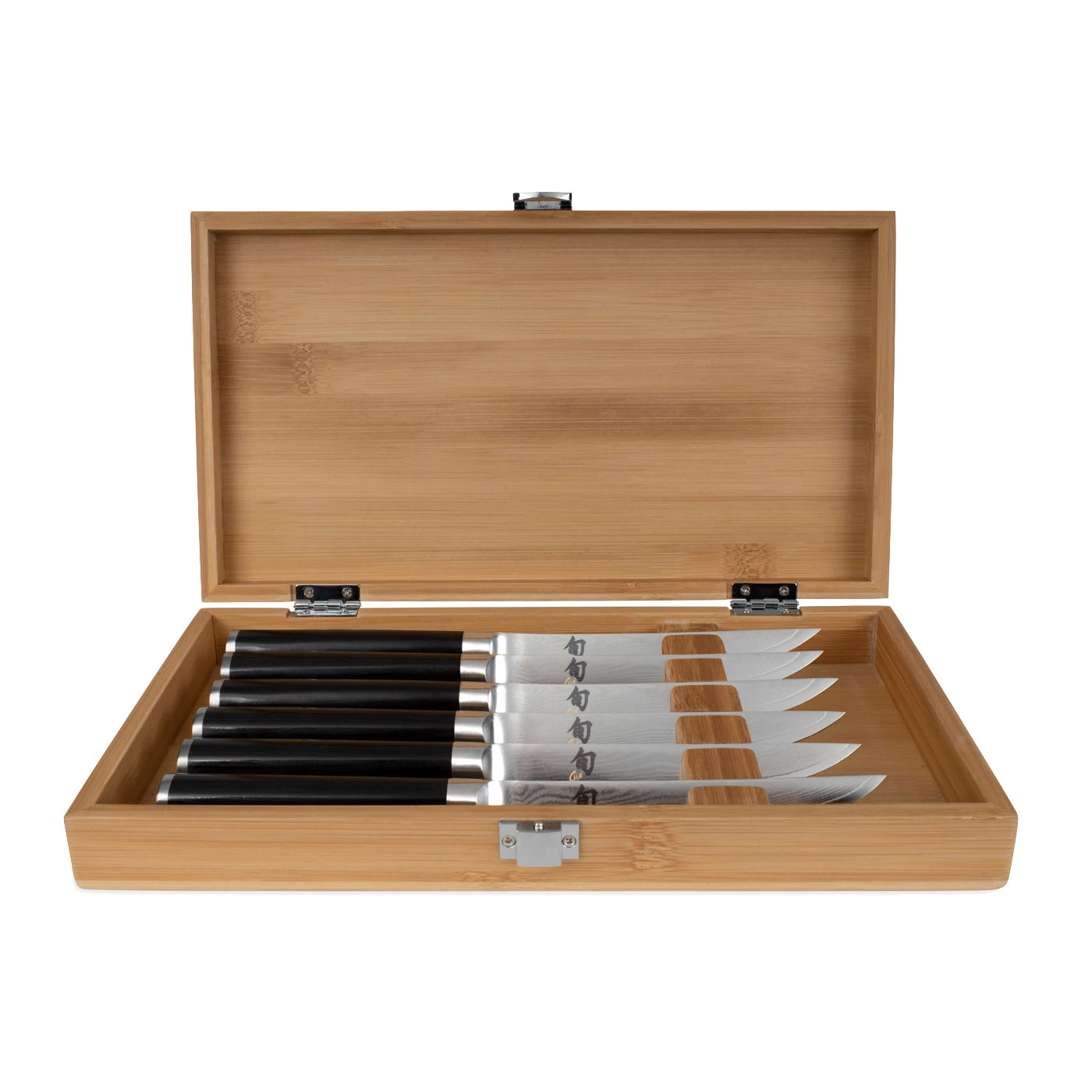 This beautiful set has six Shun Classic Steak Knives, perfect for your next dinner party or cookout. Did you know that the right steak knife can make a good steak taste even better? The key is in keeping more of the flavorful juices inside the steak. A razor-sharp knife, like the Shun Classic Steak Knife, will glide through the meat, cutting fewer of the capillaries in the steak and keeping more of the flavor inside, where it belongs. This set of four beautiful Shun Classic Steak Knives are a perfect five-inch length; long enough to handle even the largest steak, yet short enough to provide excellent cutting control. This four-piece set is ideal for a small dinner party. The Shun Classic 6-Piece Steak Knife Set comes in an elegant bamboo box, perfect for gift giving or storage.