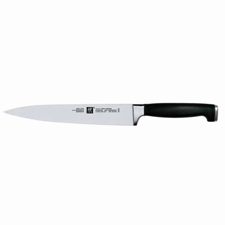A carving knife is used to carve poultry, roasts, hams, and other large cooked meats. A carving knife is much thinner than a chef’s knife (particularly at the spine) and they are generally shorter and wider than slicers, enabling them to make thin precise slices.